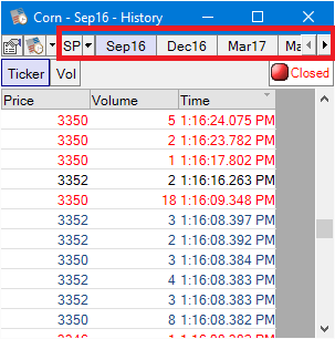 The market tabs are used to switch between a contract’s available markets. Simply click the tab for the market you desire to see. If you want to see multiple markets for the same contract at the same time create a new Market History window and set the desired market.