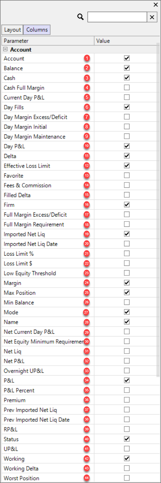 2. Layout: When clicked, the layout and settings of the current Account Board Window will be saved as default and used to create all new Order Book windows.