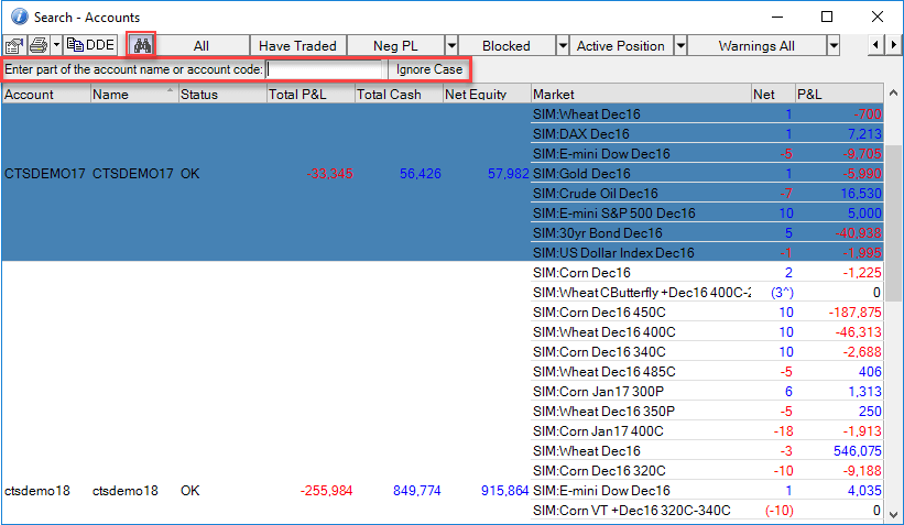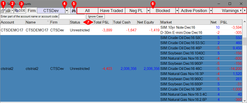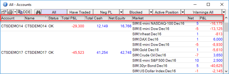 The Account Board displays account details for all the accounts that you have access to. The most common columns are visible by default. Each account listed will have a name, number, total P&L, total cash, and status. Your account will also break down P&L by providing individual market positions. Each position will display the market, net position, and P&L. Combining the P&L for all the positions will equal the account total P&L. Many additional Columns are available in Account Board Properties.