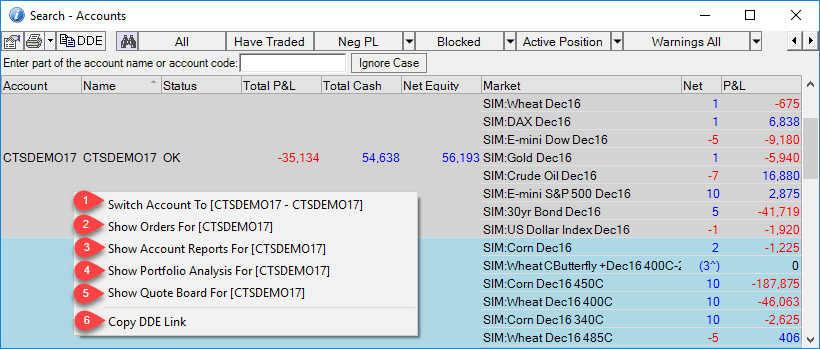 During trading your account status may change due to risk management. If your status becomes “blocked” it means that risk management is actively blocking your account from trading so that you can only trade out of your open positions. Filtered views of your accounts are provided by the View Tabs at the top of the screen. Simply click the view you desire and Account Board will display the appropriate accounts. The default, All view, is an unfiltered view showing you all accounts that are available to you.