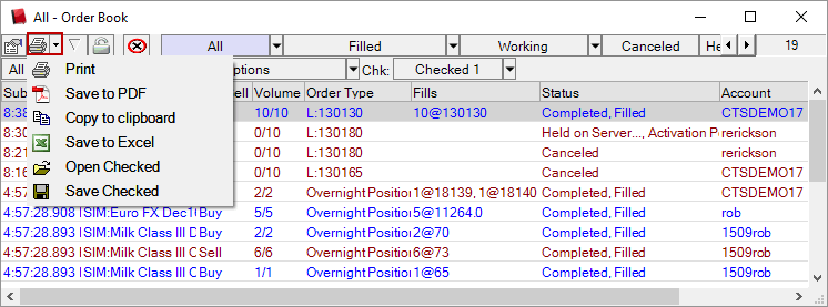 The Account Board also allows you to print the contents of a view, quickly change the Currently Trading Account and open account specific Order Books.