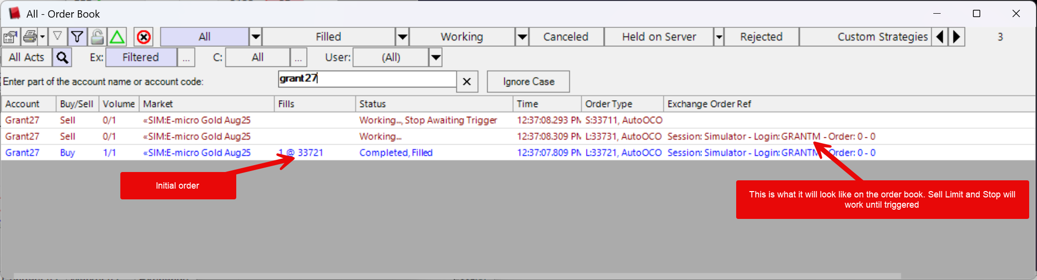 • This is the Limit side of the OCO — note it is working at the distance away from the initial fill price designated before submission.