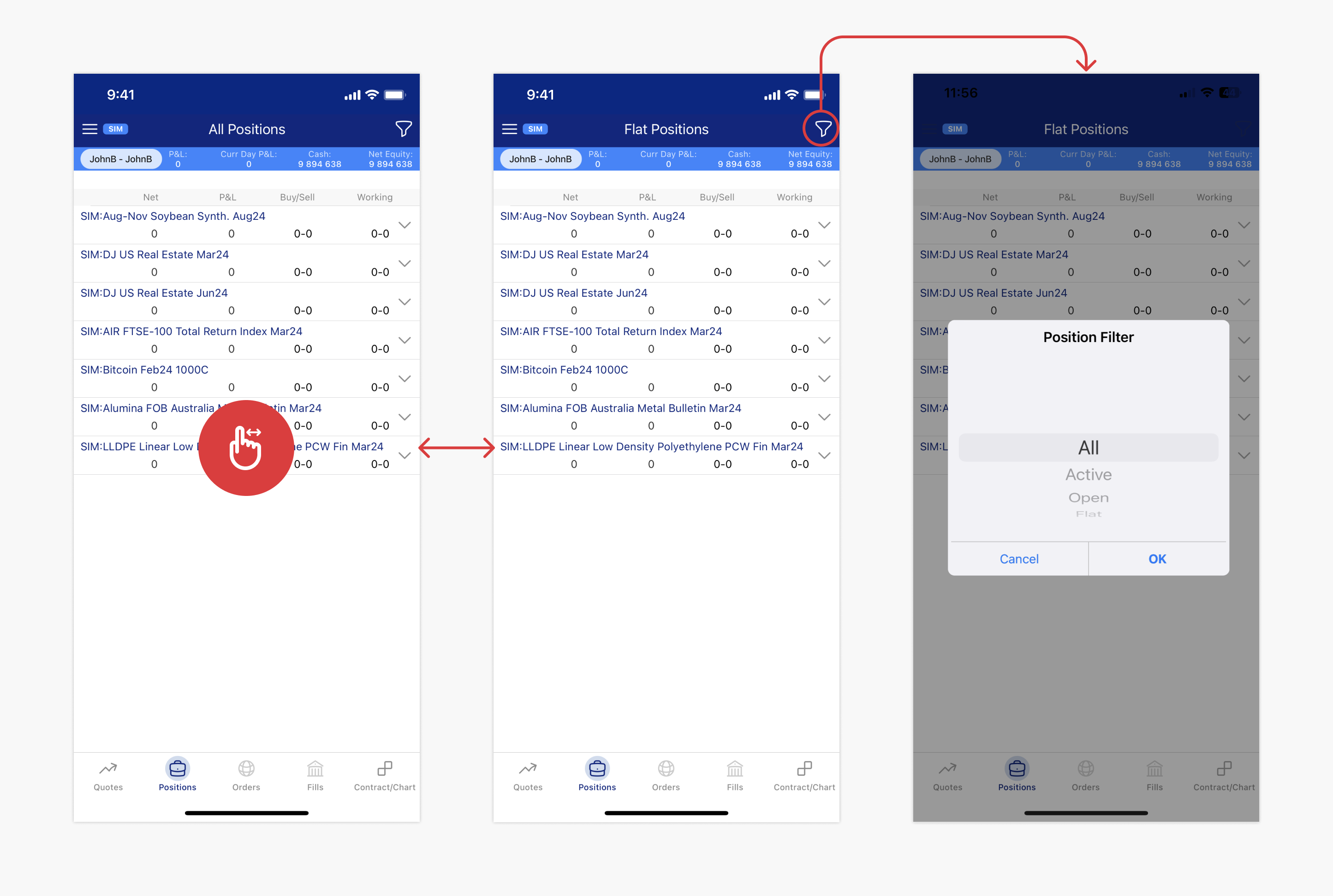 The positions tab displays the positions for the currently selected account. There are different views on the position tab. You can easily sort through them either by swiping or you can tap on the position tab to cycle through the different views.